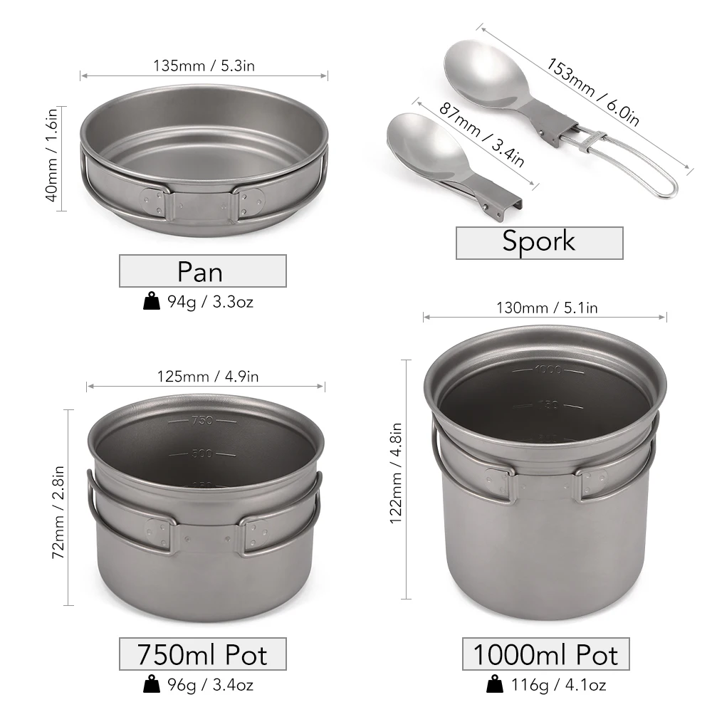 Good Product / Titanium Camp Cookware Set 1000ml 750ml Pot Pan Spoon for Outdoor Picnic Hiking Backpacking Picni